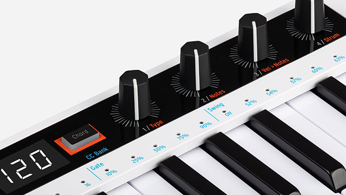 KeyStep 37’s unique & enhanced Chord mode takes your single note melodies and unfinished ideas and transforms them into musical stepping stones. Choose from multiple voicings, instrument-like strum effects, and velocity settings and make your music really sing.