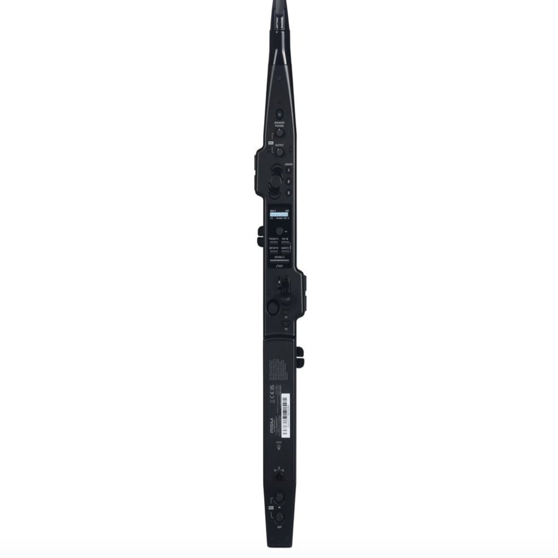 CONTROLS: Breath force sensor, Reed Bite sensor, 4 x Octave buttons (9-octave range), X/Y joystick, Control panel with clickable encoder and Mode buttons (Transpose, Favorites, Setup, Save, Sound/Edit), Assignable buttons (3), Pressure-sensitive buttons (2), separate volume controls (Speaker/Phones and Output), Gyro sensor
