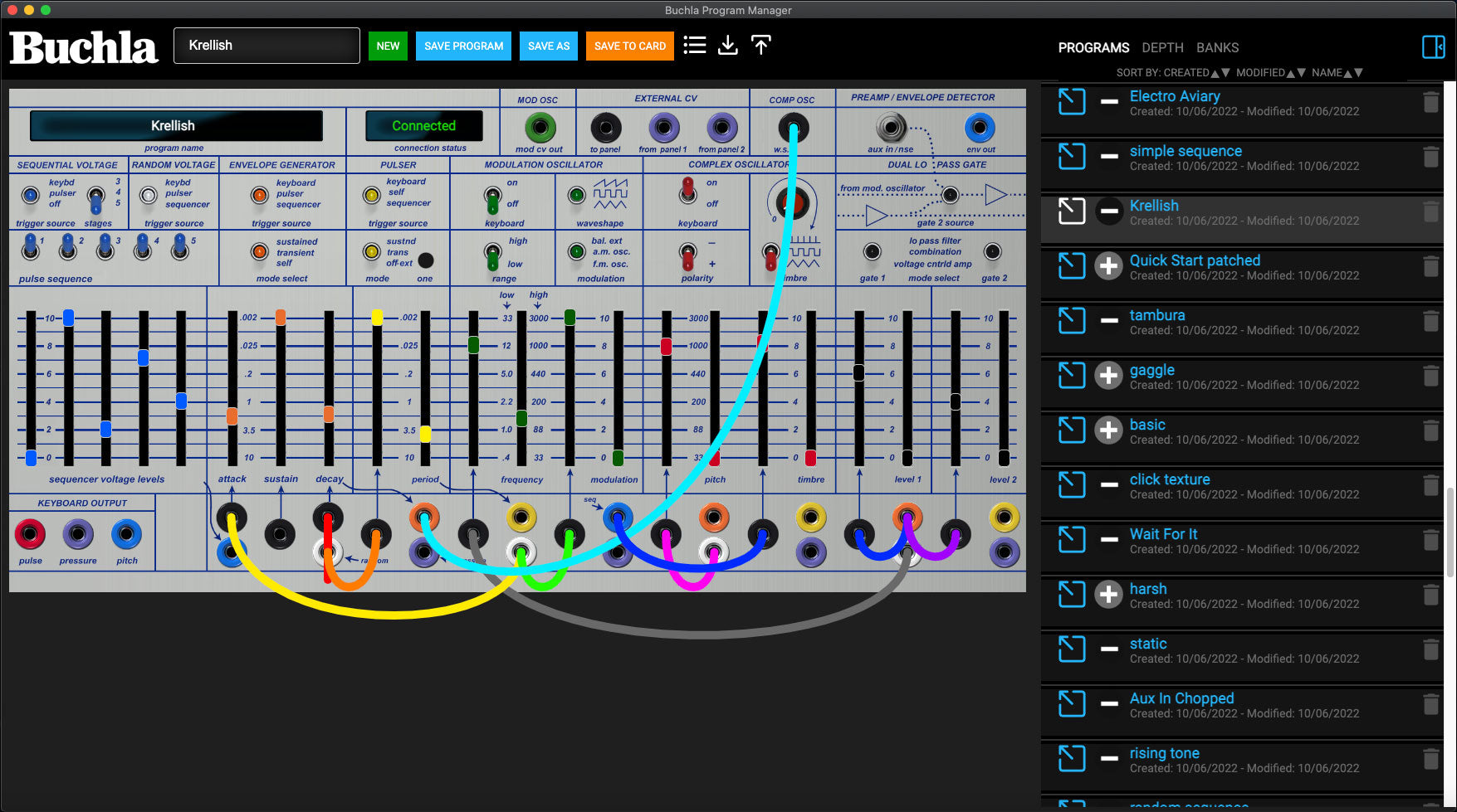 Using the Buchla Program Manager Application in Mac or Windows to design presets gives you even more programming options than the Easel’s front panel controls. The unique “Depth” controls for the patch cords put a virtual knob on every cable, allowing gradual and even inverted connection for every patch point. The fine resolution provided by high resolution controls means you can dial in extremely precise values for parameters, in a way not easily achieved by hand. The application serves as an endless extension to the Program Manager, with nearly unlimited space for presets and banks.