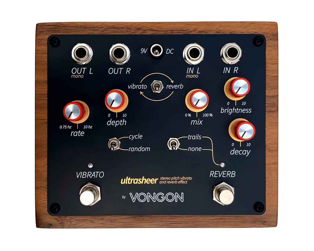 The vibrato is a smooth and transparent digital pitch shifter that preserves the full bandwidth of your input signal and does not darken the sound which is often found in the analog counterparts. Two modulation waveforms are available, “cycle” which is a sine wave for classic Leslie-speaker-type sounds and “random” which is a smoothed sample and hold waveform that creates pitch warbles similar to a warped vinyl or sun-baked cassette.